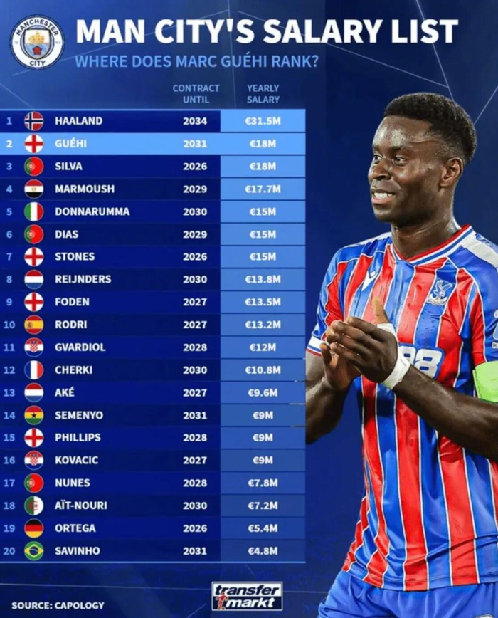 曼城薪资榜:哈兰德3150万欧年薪居首,前20球员合同曝光